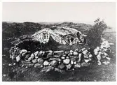 "Exteriör. Backstuga, stenstuga. Grottan ovanför Viken Röde Holme, Onsala. Primitiva stenstugor i Onsala utgjorde en slående kontrast till de ståtliga kaptensgårdarna."