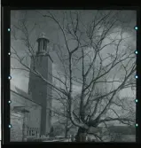 Modell klädd i öppen kappa, handskar och hatt. Knälång kjol och tröja under kappan. Bär handväska under armen. I högra hörnet skymtar en person klädd i hatt med cigarett i handen. Miljö: stadshuskajen i Stockholm.