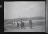 Modell klädd i öppen kappa, snörskor, handskar, och hatt. Bär handväska under armen. I högra hörnet skymtar en person klädd i hatt med cigarett i handen. Miljö: stadshuskajen i Stockholm.