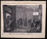 "Polis, vaktkontor". "Alla svin äro svarta i mörkret". En konstapel griper en berusad man utanför en krog. Tuschteckning av Fritz von Dardel.