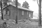 Hus 30 juni 1966 Bild på ett hus i mörkt tegel. En man står nära huset klädd i arbetskläder och håller i en häcksax.