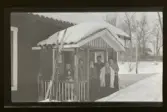 "Kraftstation, Fogelstad, Lisa och John Johansson, mor Malin" En familj porträtterad på farstubron till ett hus. Ett tjockt snötäcke ligger över mark och hus, ett par skidor står lutade mot sidan av farstubron.