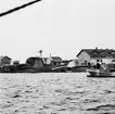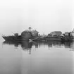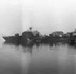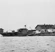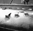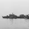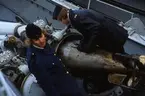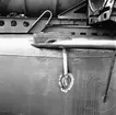 Bilden visar hur en bärgad torped halas upp på Fylgia med hjälp av en talj.