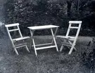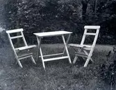 Foto av en trädgårdsmöbel i en lummig trädgård. I bakgrunden syns en vitmålad trädgårdsgrind.