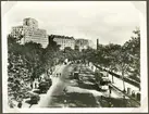 Höhandel, hästar med hölastade vagnar vid Roslagstorg 16. Dåvarande kv. Lerlaven, nu Birger Jarlsgatan 46-48, kv. Asken.