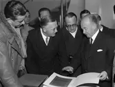 Överbibliotekarie Anders Grape "på Carolina Rediviva demonstrerar faksimilupplagan av Codex Argentus" för tyska pressmän inbjudna av Utrikesdepartementet