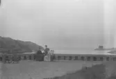 "Societetsterrassen, Marstrand. Tre personer i sittgrupp" enligt text till fotografiet