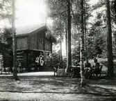 Scoutstugan med utemöbler till höger i bild och skog i bakgrunden.