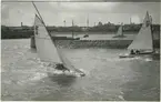 [från fotobeskrivningen:] "22 kvm HARLEKIN i Malmö hamn på utgång för en hårdvindssegling i sundet." [---]