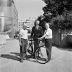 Prisutdelning efter simtävling i samband med invigningen av Ekbacksbadet. Tre grabbar på prispallen. Stadsfullmäktiges ordförande Jonas Carlsson, till vänster, ska överlämna blommor. I bakgrunden står Arne Strömberg (bilförsäljare) och filmar.