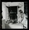 568 F. Stieg Trenter, Torremolinos. En flicka och en kvinna sitter på tröskeln utanför ett hus. En eld brinner på ett fat framför dem.