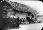 "Kaffe (Tehus) Rescht - Kazvin." (Rasht-Qazvin) Män och ungdomar sitter intill ett hus.