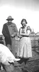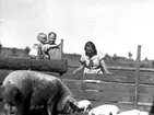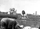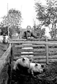 EN ÄLDRE KVINNA SOM MATAR GRISAR