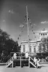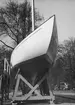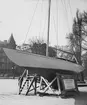 Lunds skeppsvarv. Interiör av varvskjulet med lotsbåt under byggnad.