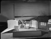 Karin Johansson i klänning med veck och midjeband och hatt på huvudet i ateljé med antik scenografi.