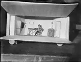 Amatörskådespelare på en scen med scenografi förställande en borg.