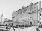 Arbogaträffen En utländsk dansgrupp har uppvisning på en uppbyggd dansbana på Stora torget. Publiken står nedanför och ser på. I bakgrunden syns butik Lyktan och infarten till Västerlånggatan.