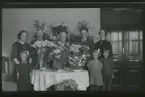"Bärsta, Karl-Erik Larsson 70 år." Grupporträtt. Kvinnor, män och barn poserar på framför ett hus. Bakom dem vid ytterdörren står en lövad båge med siffrorna '10 År' högst upp.