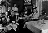 FAR OCH MOR MED SINA TVÅ DÖTTRAR UTE I TRÄDGÅRDEN. FADERN LÄSER I LIDKÖPINGSTIDNINGEN