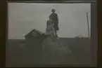 En ung man med pipa i mungipan skjutsar två flickor och ett litet barn på en moped/ motorcykel. "Fall, 1929, Gunnar och Gerda Karlsson /A-LE"