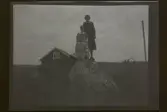 "Greta och Ingrid Jansson, Laggartorp, Fogelstad" Tre flickor poserar på en stor sten.