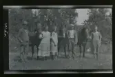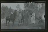 "Nilslund, Albert Petersson, Anna, Karin, Albertina" En familj framför sitt hus, mannen i förgrunden håller en häst.