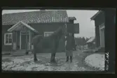 "Oskar Pettersson, Åstorp." En man håller en häst på gårdsplanen framför ett hus.