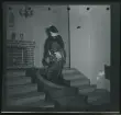 1708 N Mölnlycke väverier, mode; Stadshusträdgården, Stockholm; Mode för Mölnlycke. En modell i prickig klänning står med armarna utbredda vid en tegelvägg.