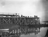 Bakom järnvägsövergången vid Stockby hållplats ses resande vid Stockholm - Roslagens Järnvägar, SRJ motorvagn.