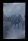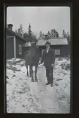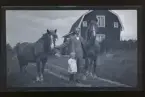 "Fallet, August Karlsson, Gimmersta." En man och ett litet barn står framför ett hus, mannen håller två hästar.