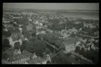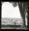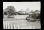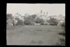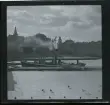 Vy över vattnet från Lidingö mot Hjorthagen med kyrkan och gasklockorna.