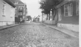 Medföljande text till fotografierna. Fiskare flyttar sitt hus för andra gången på 30 år.År 1905 uppförde fiskare Gustav Johansson en en familjsvilla i Stafsinge, år 1926 flyttade han huset till Strandridaregatan. 16 juni 1956 flyttades huset till Sanddynevägen. Nores Gustav kunde till och med koka kaffe och laga mat under färden.
