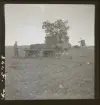 Skörd och upptagning av säd på Store-Hansa i Ulvatorp. Mannen går med lien och två kvinnor i hucklen knyter nekar. I bakgrunden ligger gården med bostadshus och uthuslängor med halmtak.
