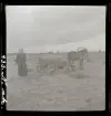 Paus i potatisplockandet på okänd gård i Veddige för att posera med korgar och hackor framför "Kloar-Eriks" kamera. Flickan längst till vänster håller upp en pipa och mannen till höger om henne skojar till det med korgen på huvudet. På jorden ligger ännu oplockade potatisar. Någon av männen är Karls August.