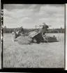 Skördearbete. Fyra stycken självbindare dragna av hästar på rad vid veteskörden på Lindhofs kungsgård. I förgrunden ligger de bundna vetenekarna. Fotografi från slutet av 1920-talet.