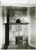 Vita gästrummet i övre våningen. Kakelugn med blågrönt stänk, rätt ymnigt och delvis flutet. Träfötter på rund järnskiva. smidd enkellucka. Krönsims troligen upp och ned. Golvet oljemålat gulvitt med schablonerade stjärnor, grå fris längs väggarna.