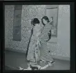 1708 N Mölnlycke väverier, mode; Stadshusträdgården, Stockholm; Mode för Mölnlycke. Modell poserar, tittar i fickspelgel.