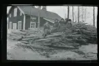Göteveflickor sågar ved. Nedre raden Maja Andersson Kommevalla, Ester och Beta Setterberg. Övre raden 3 okända, Anna Götlind, Signe Andersson.