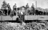 FYRA MÄN PÅ ETT BYGGE I FÖRGRUNDEN EN TIPPVAGN PÅ ETT INDUSTRISPÅR.
