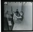 1677 B Konstfackskolan (tösen Boheman). Skrattande elever i målerisalen. En uppochned vänd pall agerar staffli.