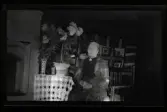 "Fridas faster i Hälleforsnäs 70 år." Porträtt av en kvinna som sitter vid ett bord fullt av gratulations-blommor.