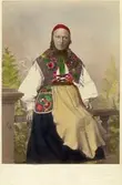 Ingeborg från Färnäs, Mora, klädd i folkdräkt från Dalarna. Handkolorerat porträttfoto.
