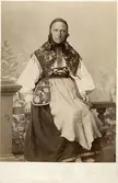 "Floda utställningen 1897." En kvinna poserar i en folkdräkt med skinnförkläde