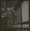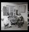 En man och en pojke sitter utanför ett hus och lagar fiskenät.