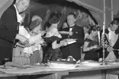 Didners damkonfektion, Växjö. Firmafest på arbetet. Man har klätt upp sig och sitter vid dukat bord, beredda för kaffe.