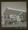 Två män öppnar upp ett marknadsstånd med hemslöjd. Skansen, Stockholm.