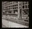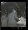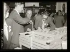 Torghandel på Stortorget i Kalmar. Närmast kameran saluförs kött som besiktigats i köttbesiktningsbyrån i byggnaden till höger om rådhuset i bakgrunden.