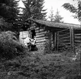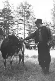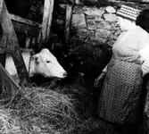 Olga, född Olsson, Forshälla 1891-05-12, Sven Jonsson, Hjärtum 1915-05-14. Kortet taget i samband med att korna skall mjölkas.