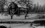 Bystad skola. Skolhuset, fasaden mot trädgården, på vinter. Bilden har i kanten en tryckt text: "jan 69". Dateringen avser när bilderna framkallades. Den måste dock vara tagen tidigare, eftersom huset målades om sommaren 1968. Det troligaste är att den togs vintern 1967-68 och att rullen framkalldes senare.