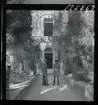 Folkdräktsklädda människor. Hästskjuts vid gård. Grindöppning.